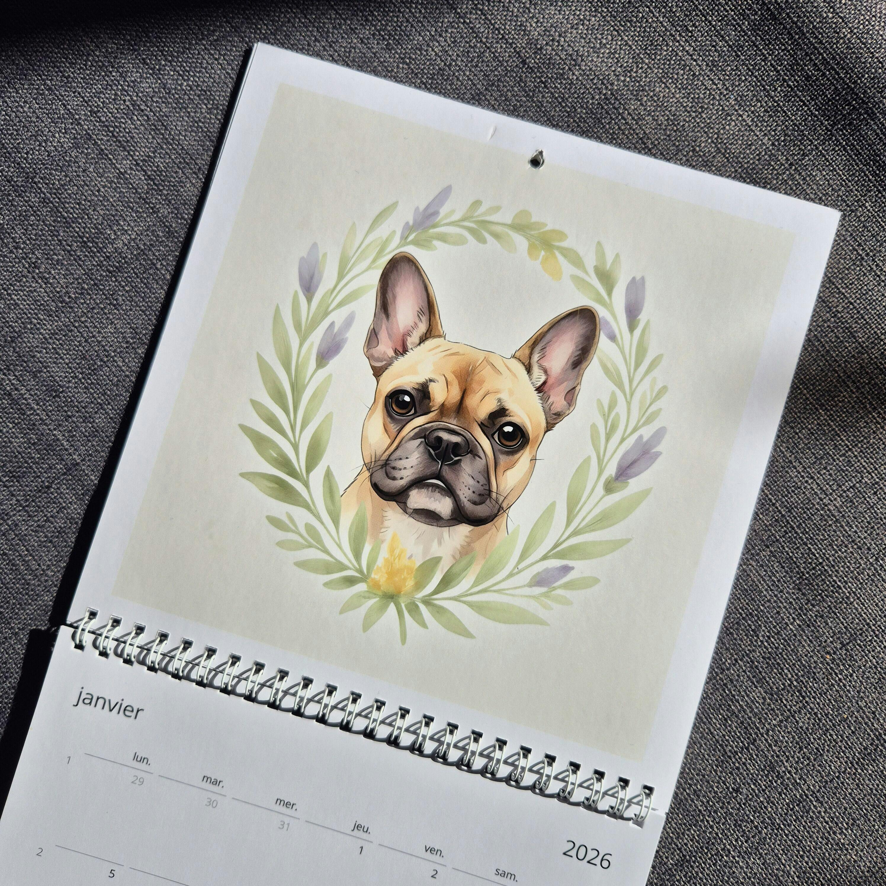 Wall Calendar 2026 "Dog with Leaf Crown" (French)